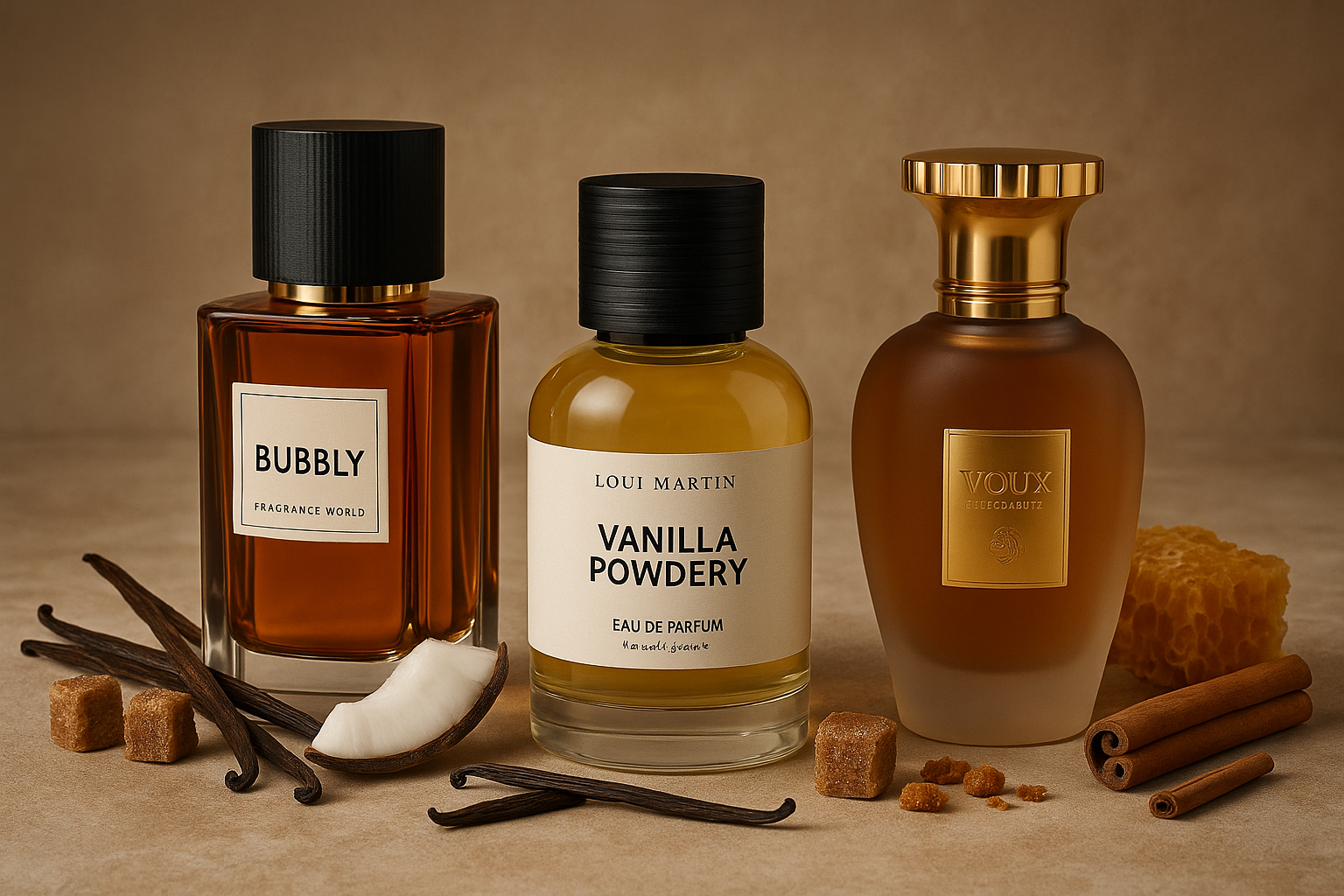 Sélection centrée sur la vanille sous trois formes distinctes : épicée, poudrée, ambrée-gourmande. Ensemble cohérent, aucun parfum ne duplique l’autre : trois ambiances, un seul fil conducteur.